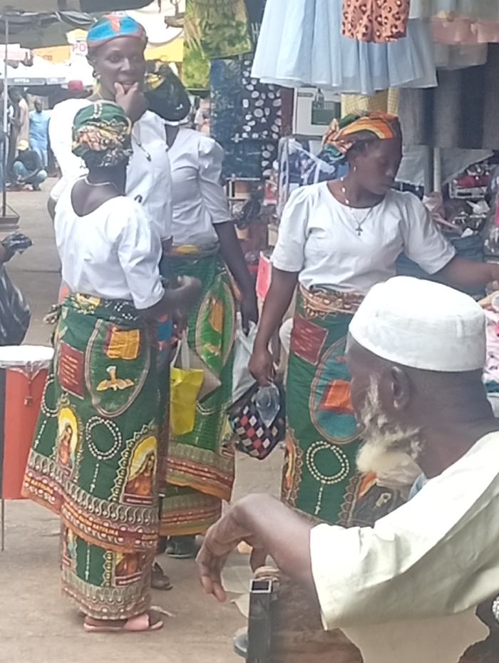 Three women wearing matching green skirts and white blouses stand in an outdoor market setting. The skirts feature images of religious figures and decorative patterns. Two women wear head wraps. They appear to be shopping or browsing among hanging clothes. An elderly man with a white beard and a white cap sits in the foreground, partly obscuring the view of the women. Other people and market stalls can be seen in the background, creating a bustling atmosphere.