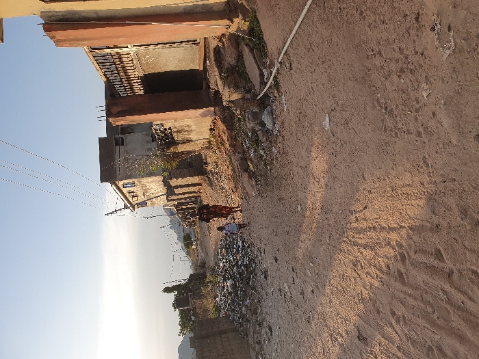 The image depicts an unpaved residential street in Lokoja, Nigeria, under a clear, bright sky, likely during the day with long shadows