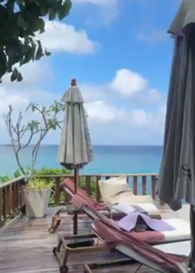 The camera pans across a beautiful, idyllic outdoor scene. The foreground consists of a wooden deck with lounge chairs, an umbrella, and a potted plant. Beyond the deck, there's an infinity pool overlooking a stunning blue ocean under a partly cloudy sky. In the distance, several boats move across the water.