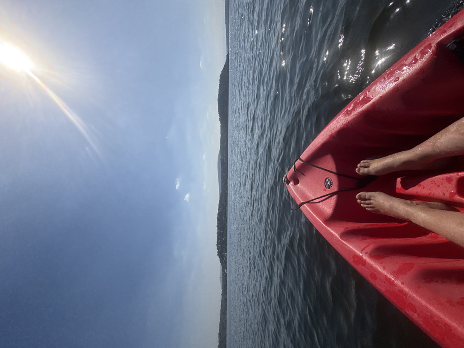 A low-angle shot presents a red kayak on a body of water under a bright, sunny sky. Visible feet rest within the kayak. The sun shines intensely, casting glare on the water's surface. A distant treeline appears on the horizon. The photograph is taken at an angle, showcasing the blue sky and calm water alongside the kayak.