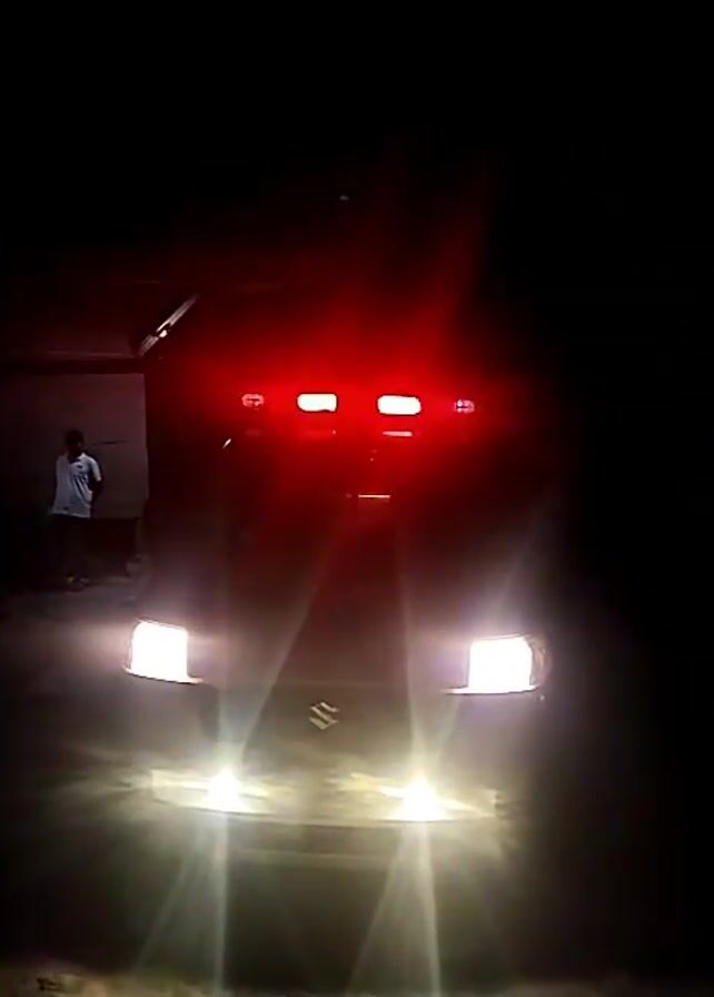 A car, likely a Suzuki, is parked at night with its headlights and red emergency lights flashing. A person is standing near a building to the left of the car. The area is dark except for the light emitted by the car.