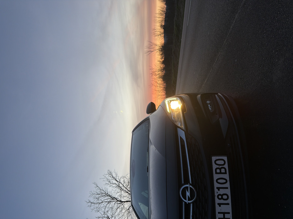 A black Opel hatchback, bearing Bulgarian license plate H 1810 BO (Shumen Province), is stationary on the asphalt shoulder of a two-lane road near Dalboki, Bulgaria. The vehicle's front left quarter is prominent, with its left headlight illuminated. The scene is set during either sunrise or sunset, evidenced by the gradient sky transitioning from deep orange and pink near the horizon to light blue overhead. Bare deciduous trees are visible on the left and a line of bare bushes or small trees defines the distant horizon to the right. The road features a solid white line marking the shoulder. No individuals are present.