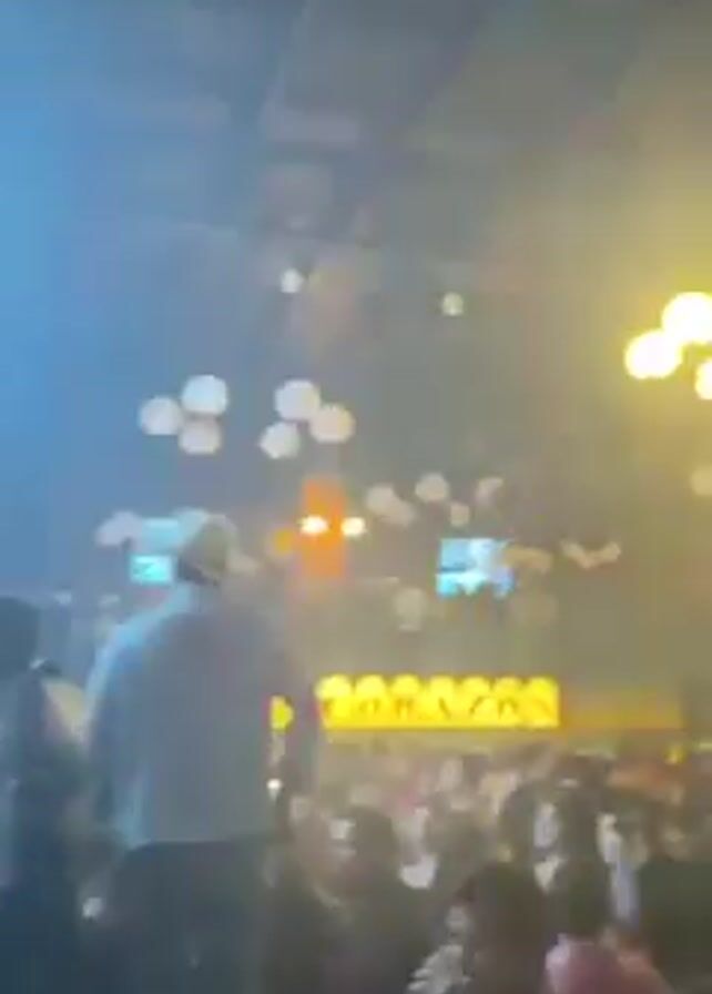 The video depicts a crowded indoor venue, possibly a club or concert hall, with many people standing and moving around. The lighting is dim and dominated by yellow spotlights and overhead spherical lamps. A person in a white shirt and dark pants is visible on what appears to be a slightly elevated platform, possibly a small stage. Many attendees hold up their phones, likely recording the event or taking pictures. A sign that reads "CORAZON" can be seen in the background. There is a general sense of excitement and activity in the scene.