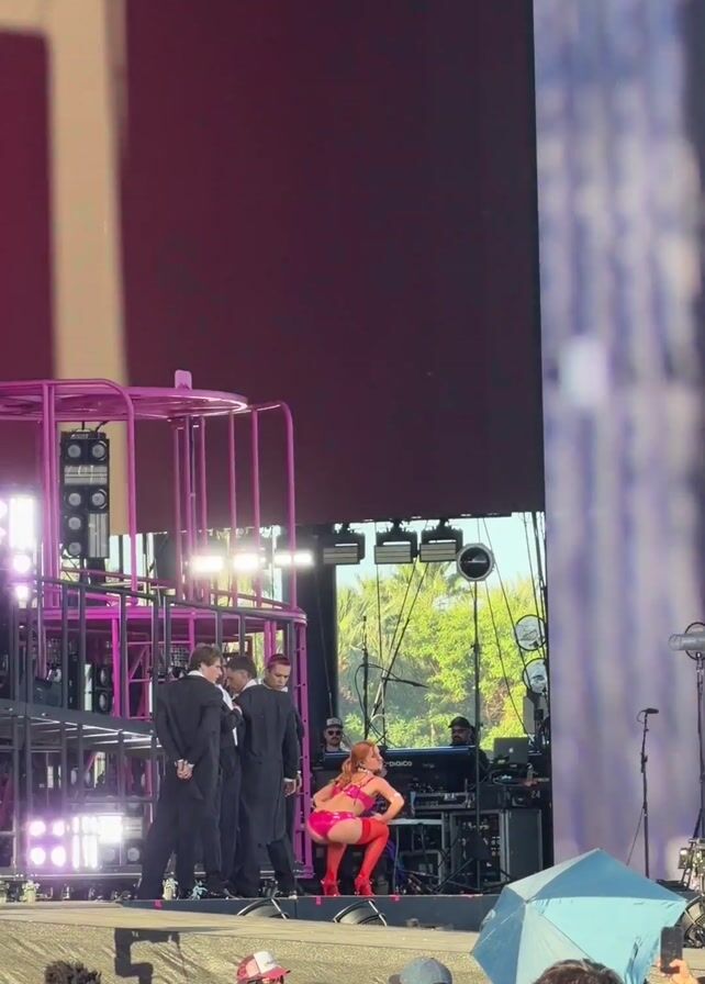 live performance at a concert. A woman in a pink bra and underwear with red stockings and heels is on stage. She is surrounded by men in black suits and sunglasses. Behind them is a pink metal cage structure with lights. There are large screens in the background with varying color displays. The camera is focused on the stage, and in the foreground, you can see the heads of the audience. The overall environment is a large outdoor venue with visible trees and bright sunlight.