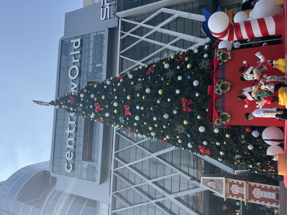A towering Christmas tree, heavily adorned with colorful ornaments, bows, and snowflakes, stands in front of the "CentralWorld" building