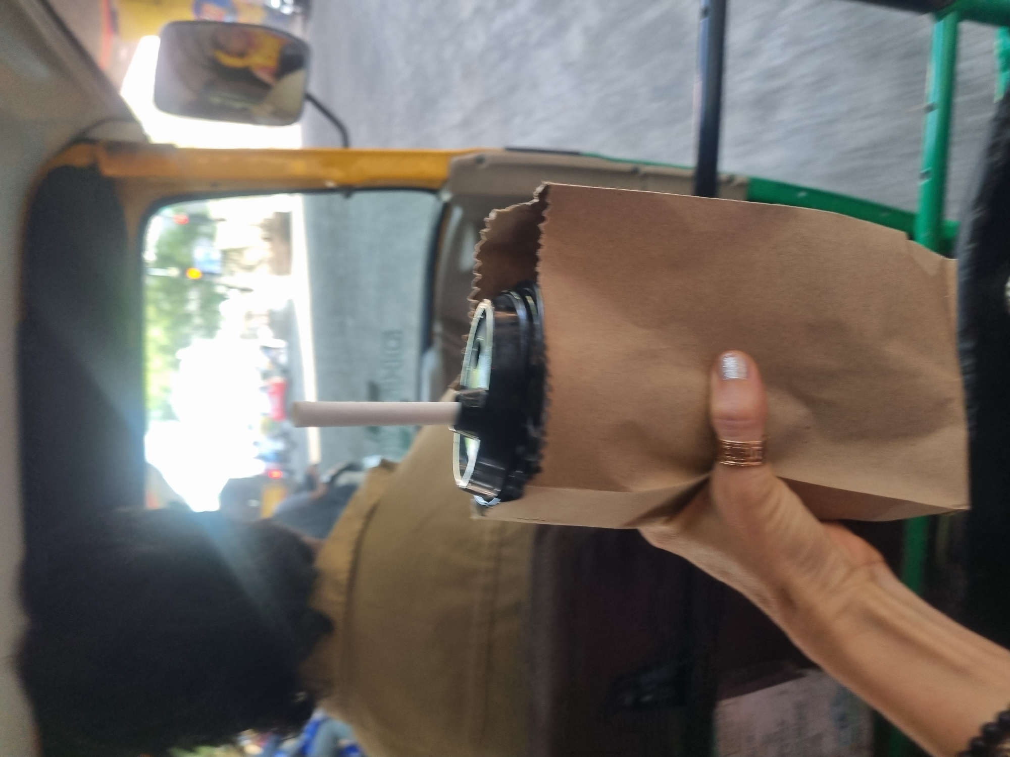 The image depicts a passenger's perspective from inside a moving auto-rickshaw on a city street in Bengaluru, India. In the immediate foreground, a left hand, displaying a silver glitter nail polish on the middle finger and multiple thin gold-toned rings, holds a brown paper bag. The bag contains a black plastic cup with a black lid and a white straw, with the top edge of the bag appearing jagged. A dark beaded bracelet is partially visible on the wrist. In the midground, the back of the auto-rickshaw driver is visible, wearing a light brown shirt and having dark, curly hair. The auto-rickshaw's interior framework, characterized by a yellow vertical bar and a green horizontal bar, is discernible. A rearview mirror on the right side reflects a blurred yellow object. The background, heavily blurred due to motion, reveals an urban street scene under bright daylight. Elements include other vehicles and indistinct human figures, indicating busy traffic. A traffic light displaying a red signal is faintly visible on the right side of the road, and green foliage can be seen in the distance. The specific street location within Bengaluru is not identifiable from the available visual information.