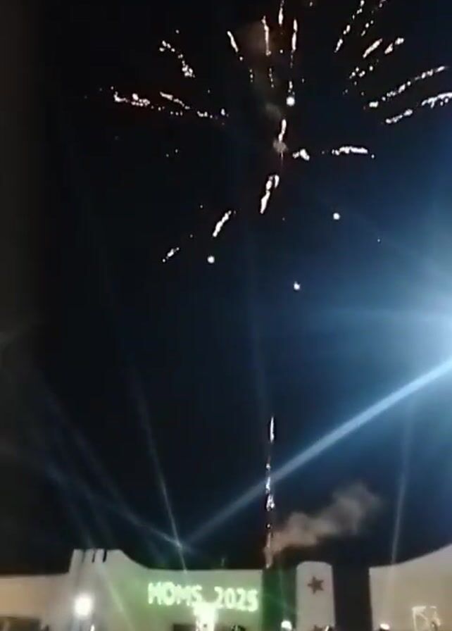fireworks exploding in the night sky over a building with green lettering that reads "HOMS 2025". There's a crowd of people in front of the building, and bright spotlights are shining upwards. Some smoke can be seen near the building. The video appears to be taken from a distance. The fireworks are colorful and create a starburst effect.