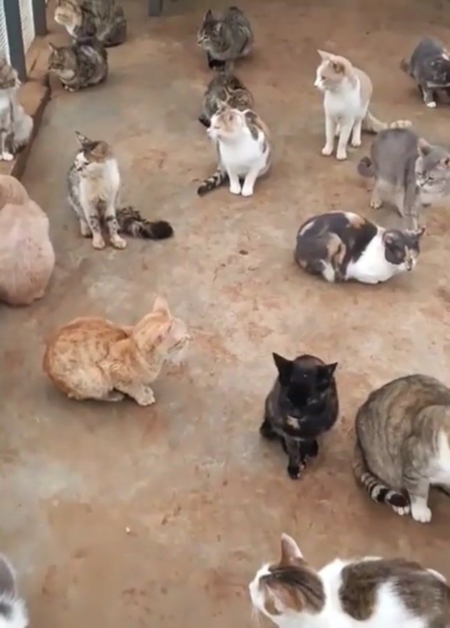 - "A medium shot shows a group of cats gathered in a fenced-in area with a cement floor" by FM-E8rQG2, licensed under CC BY 4.0