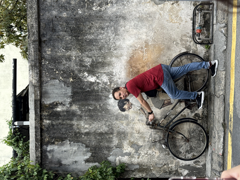 - "A man in a red t-shirt and jeans poses on a bicycle next to a mural of a boy riding a bicycle" by FM-Mlchq1, licensed under CC BY 4.0