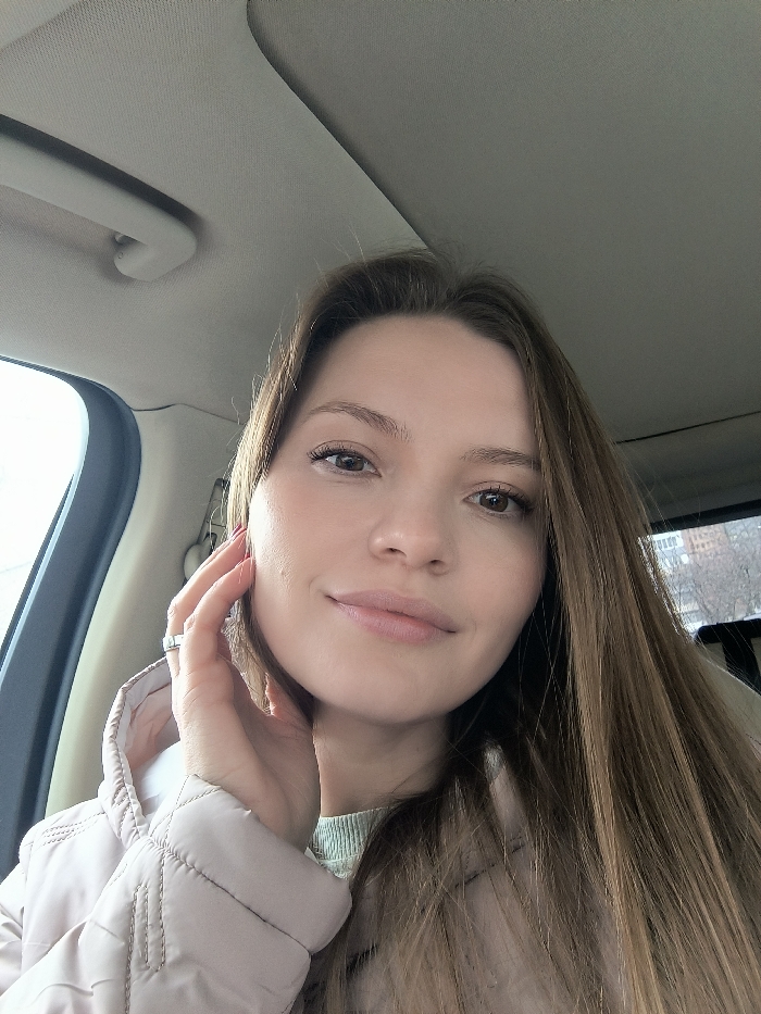 A female individual is depicted from the chest up, positioned inside the passenger compartment of a vehicle. Her long, light brown hair is visible, falling over her shoulders. She has brown eyes and a faint smile. Her right hand is raised, with fingers lightly touching her right cheek and jawline; a silver-colored ring with a flat band is visible on her right ring finger. She is wearing a light pink or beige quilted jacket over a light green or mint-colored garment. The vehicle's interior features a light-colored headliner and a grab handle above the left window. Through the blurred car window on the right, an urban environment is discernible, including a multi-story building and bare tree branches, consistent with an urban area in Vinnytsia, Ukraine. The overall lighting suggests daylight.