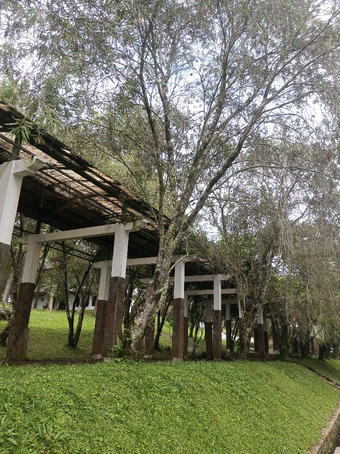 An open-air structure with a weathered roof is supported by columns with dark bases and white tops. Lush green grass covers a sloping area, with a few trees scattered within and around the structure. The trees have light-colored bark and delicate branches. Overlapping foliage and the architectural elements create a textured and layered composition. The lighting is diffused, contributing to a tranquil atmosphere.