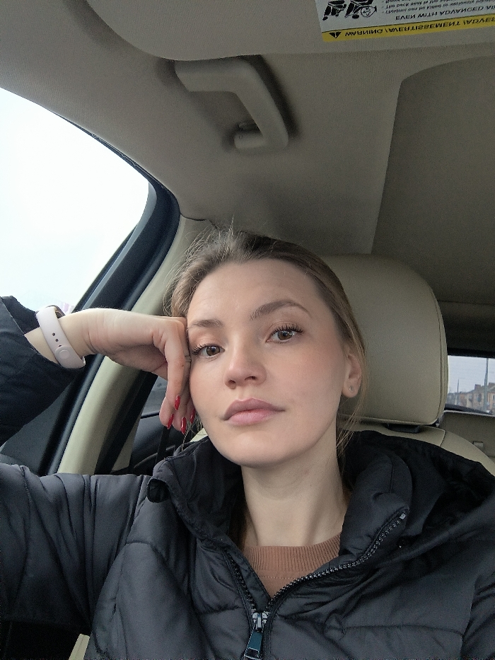 The image captures a female individual seated in the front passenger seat of a vehicle in Vinnytsia, Ukraine. The individual, an adult female with light brown hair, fair skin, and light-colored eyes, is positioned centrally, looking directly into the camera. She wears a black puffer jacket over a brown long-sleeved top. A light pink or beige smartwatch is visible on her left wrist. Her right hand, featuring red nail polish, is positioned with the palm resting against her left cheek, fingers extended towards her temple. The vehicle's interior is visible, featuring a light-colored (beige or tan) headliner and seat upholstery. An inverted English airbag warning label is visible on the sun visor above the subject. A light-colored grab handle is present on the ceiling. A dark seatbelt strap crosses the subject's chest. Through the vehicle's front passenger window, an overcast sky is visible. Through the rear window, a blurred urban environment with indistinct buildings and vertical structures (possibly utility poles) is discernible. The scene is illuminated by ambient daylight, suggesting an overcast condition.