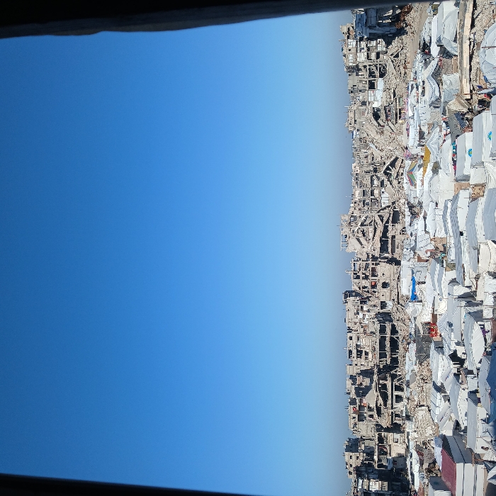 A stark contrast exists between the vast expanse of a clear, azure sky and the devastation below. The lower half of the image depicts a scene of destruction, with crumbling buildings and rubble stretching into the distance. Interspersed among the ruins are rows of white tents, likely a refugee camp, providing temporary shelter amidst the wreckage. The scene suggests a city ravaged by conflict or a natural disaster, highlighting the fragility of human structures against the backdrop of an indifferent sky.