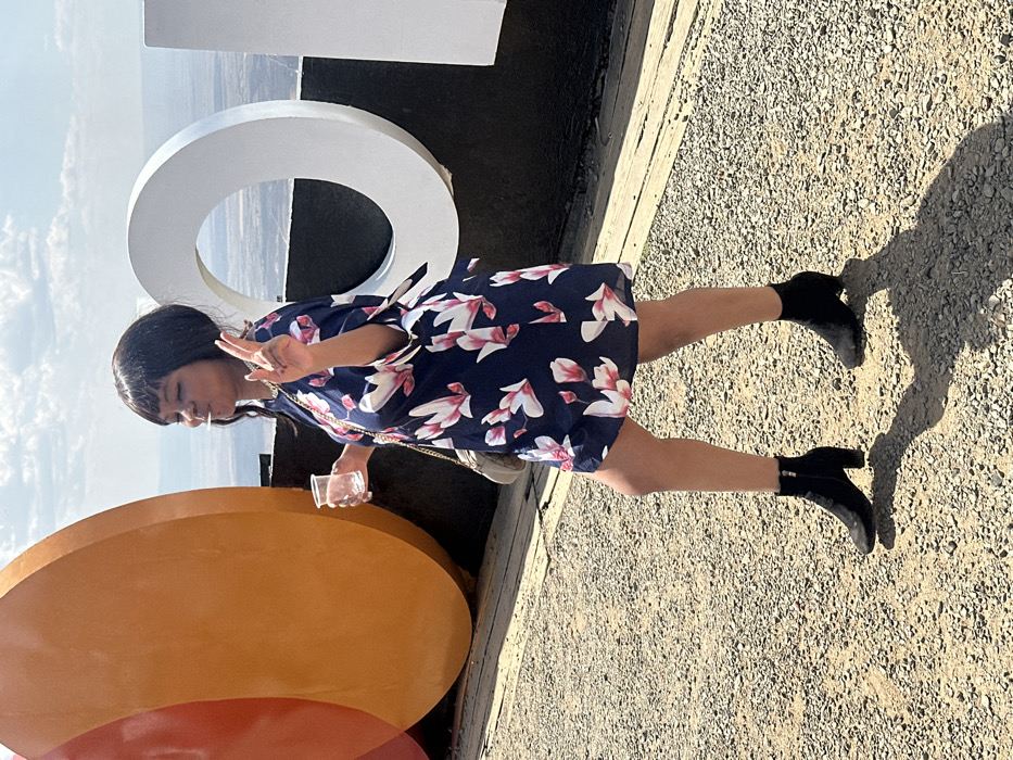 An adult female is depicted in a three-quarter profile at the Great Rift Valley Viewpoint in Lari/Kirenya ward, Kenya. She is walking right on a gravel-covered surface under bright sunlight, which casts distinct shadows. The woman has dark hair with bangs and is wearing a navy blue, short-sleeved dress with white and pink floral patterns, black ankle boots, a necklace, and a light-colored crossbody bag with a gold chain strap. Her left hand holds a clear plastic cup. Her right hand is raised, forming a peace sign with her index and middle fingers. Her lips are slightly puckered. Behind her are large three-dimensional letters that form part of a sign, including a prominent orange 'O' on the far left and a white 'O' on the right, consistent with "OLOKIDON." The background beyond the sign features a vast, hazy landscape under a partially cloudy sky.