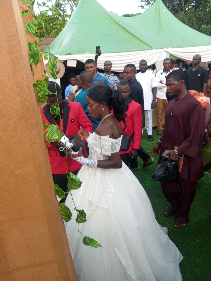 In Amokvo, Nigeria, an outdoor celebratory event is captured, featuring a woman in bridal attire and multiple attendees