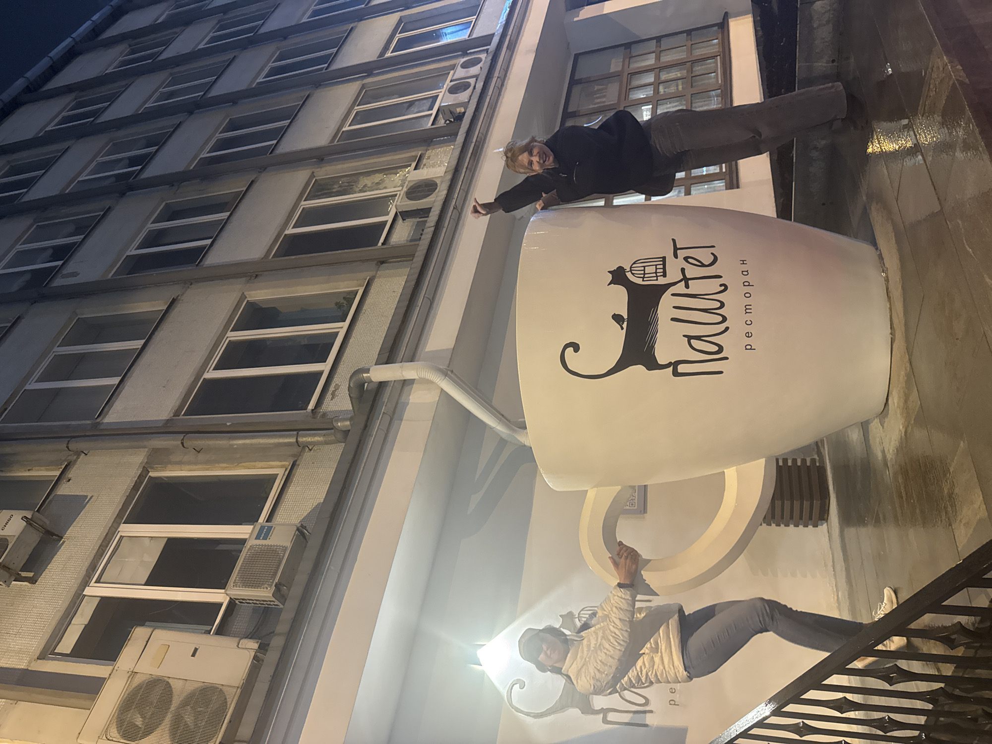 The image captures an outdoor scene in Yekaterinburg, Russia, featuring a large, oversized coffee cup-shaped sign for a restaurant called "Паштет" (Pashtet). The sign is predominantly white with black lettering and a logo depicting a cat with a birdcage. Two individuals are interacting with the sign. One person, with blonde hair and wearing a black jacket and grey pants, is perched atop the cup, posing with a thumb up. Another person, wearing a white jacket and grey pants, is holding the handle of the cup, seemingly posing for a photo as well. The background features a multi-story building with numerous windows and air conditioning units. The street appears wet, suggesting it may have recently rained. A set of wrought-iron stairs are visible to the right of the image.