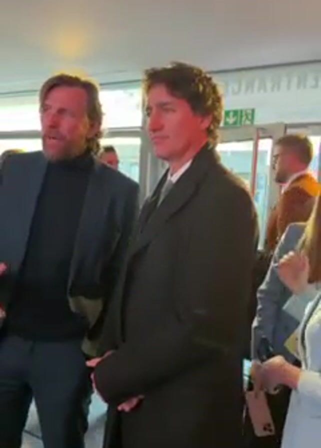 Justin Trudeau standing in what appears to be a public event setting. He is wearing a dark coat over a suit and tie. He has a serious expression as he looks to the right. A man in a black sweater and jacket stands to his left and appears to be talking. Other people are visible in the background near an entrance marked "ENTRANCE". The lighting is bright, and the overall atmosphere is one of a gathering.