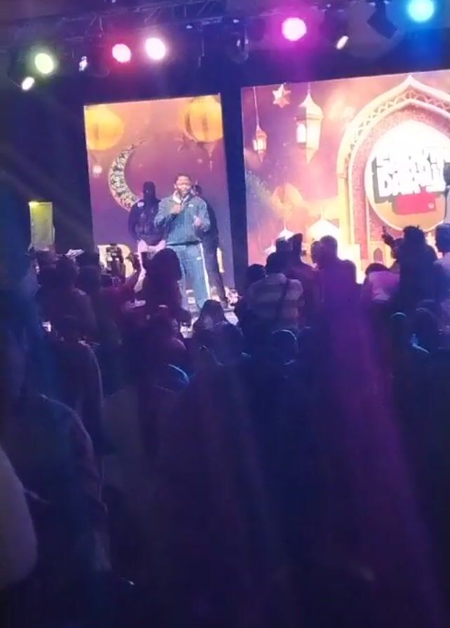 man on stage in front of a crowd. The man is wearing a teal tracksuit. There are two large screens behind him showing images of lanterns, stars, and crescent moons. A sign on the right-hand screen reads “SAHUR DAIMA”. The crowd is partially visible, appearing as silhouettes. Some people are holding up their phones to record. There are stage lights above the stage, shining down on the performer. The room appears to be a large event space.
