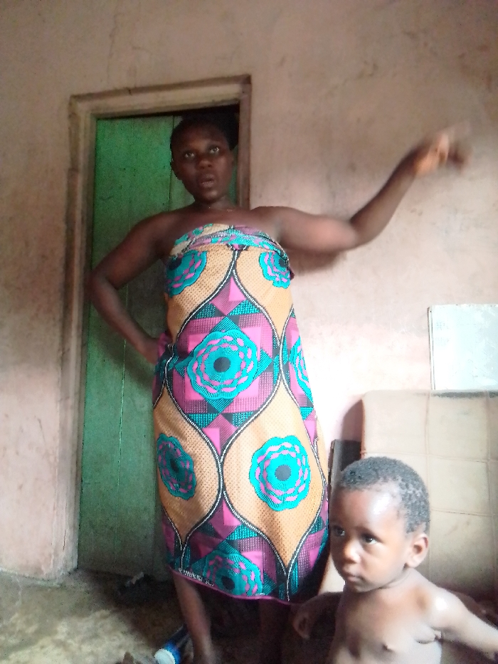 A woman stands in a room wearing a colorful, patterned dress. She points to the right with her right arm, her left arm is on her hip. A toddler is standing to her right, shirtless. A green door is behind the woman. The room appears to be in disrepair, with peeling paint on the walls. A white appliance is to the right of the toddler.