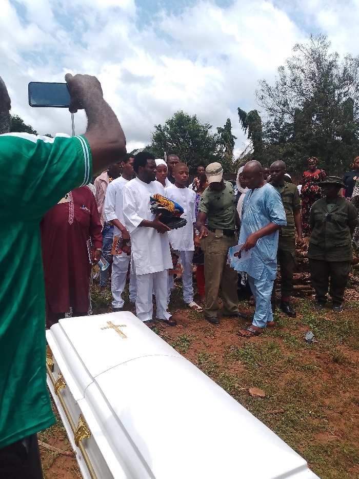 An outdoor scene in the city of Eke, Nigeria, depicts a gathering of approximately fifteen individuals around a white coffin with gold-colored handles and a gold cross emblem on its lid, resting on reddish-brown earth with sparse green vegetation. In the immediate foreground, the back of a person wearing a green and white striped shirt is visible, with their right arm raised, holding a black smartphone horizontally, seemingly recording the event. Central to the gathering, a man in a long-sleeved white tunic and trousers holds a stack of folded multicolored textiles and possibly a pair of dark shoes or boots. He is positioned near the head of the coffin. To his right, another man in a light blue traditional tunic and trousers holds papers or a brochure, appearing to interact with a person in a beige cap and green camouflage shirt and khaki trousers. Several other individuals, including some in military-style or security uniforms (dark green camouflage), stand around the coffin, observing the proceedings. Other attendees are dressed in various traditional Nigerian garments and casual wear. The background features dense green foliage and trees under a partly cloudy sky, indicating daylight conditions. The ground beneath the group is uneven, characterized by exposed soil and scattered dry leaves.
