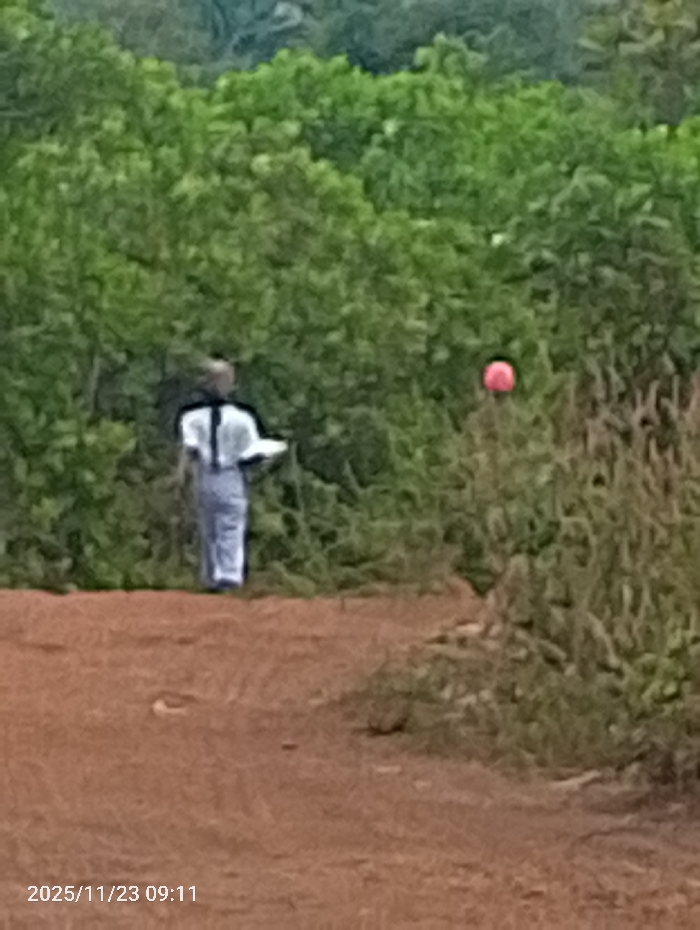 The scene in Ejule, Nigeria, displays an unpaved, reddish-brown dirt path extending into the mid-ground, flanked by dense green foliage consisting of shrubs and trees. A solitary figure, appearing human-like, stands on the path in the mid-ground, viewed from behind. The figure wears a light-colored upper garment and dark-colored lower garments, seemingly walking towards the background. To the right of the figure, embedded within the green foliage, is a distinct red, spherical object. The environment is outdoors under daylight. A timestamp "2025/11/23 09:11" is visible in the lower-left corner.