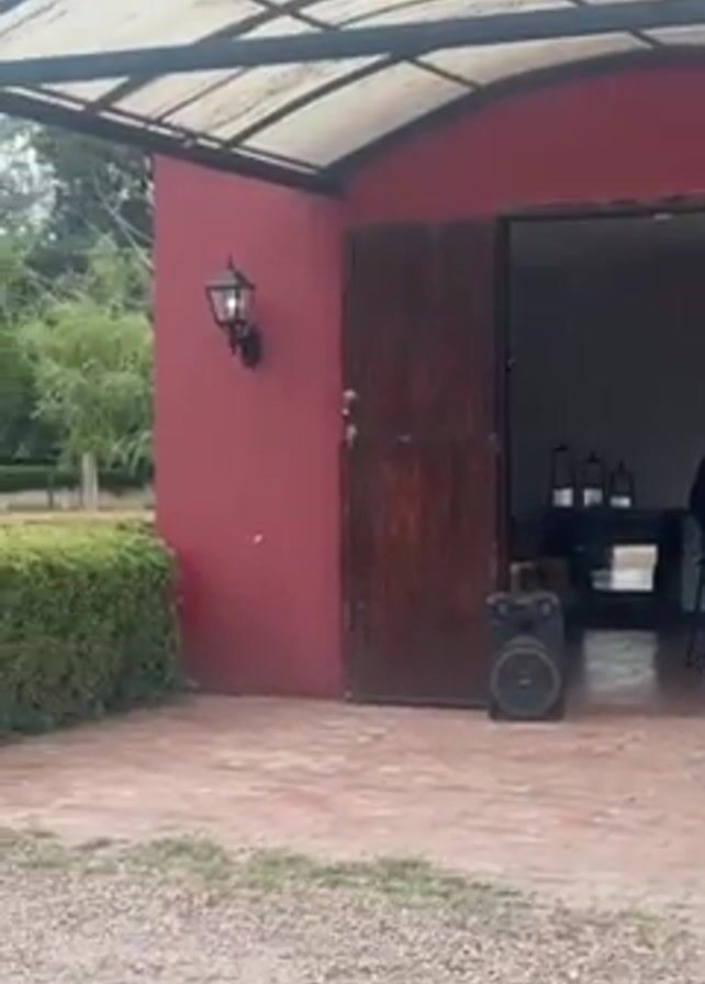 n outdoor venue. A red building with an open doorway is visible, with a person standing inside the doorway and a speaker outside. The camera pans to show a green lawn with manicured hedges and trees. An old green wagon with red wheels sits on the lawn. Several tables and chairs are set up under trees in the distance. A white gravel path runs through the lawn, and another old wagon is located on the lawn.