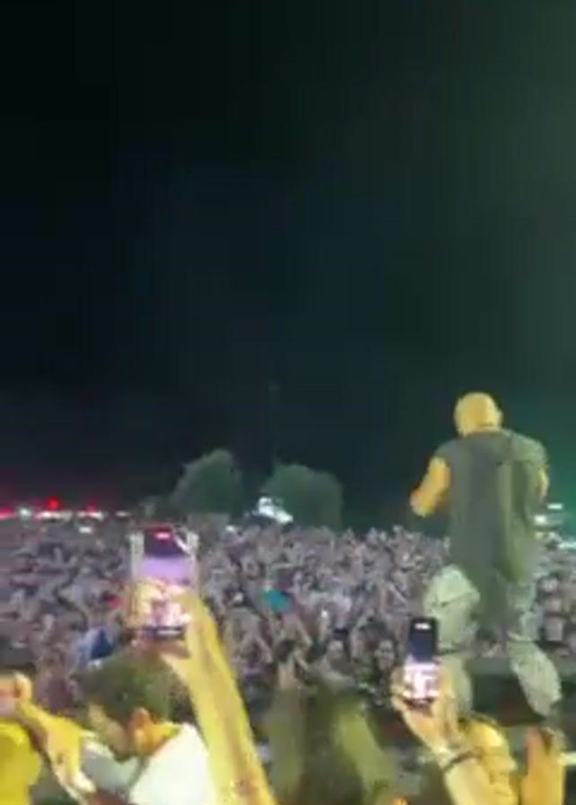Here is a forensic description of the video: The video showcases a live music performance at night, with a massive crowd gathered to watch. The scene is illuminated by concert lighting, including red spotlights, adding to the energetic atmosphere. In the foreground, several individuals are holding up their smartphones, presumably recording the event. At the front of the crowd, a bald man stands on an elevated platform, seemingly engaging with the audience. In the background, a large artificial rock structure serves as the backdrop for the stage, further enhancing the visual spectacle of the performance.