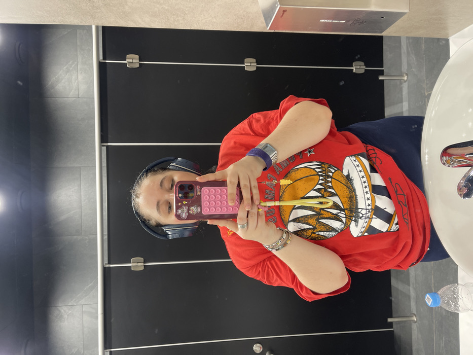The scene depicts a solitary individual captured in a mirror selfie within a public restroom in Khimki, Russia. The person, appearing to be an adult female, is centered in the frame, holding a smartphone with both hands to take the photograph. She is wearing blue over-ear headphones and a red short-sleeved t-shirt featuring a graphic design of an orange, sharp-toothed basketball atop a striped drum. A yellow lanyard with charms hangs from her neck. Her left wrist displays multiple bracelets and a ring on the ring finger, while her right wrist has a wide dark blue or purple band over a metallic one. Dark blue shorts or trousers are visible beneath her t-shirt. The smartphone is housed in a dark pink case adorned with cartoon stickers and a pink "Pop It" style grip on the back. The background, reflected in the mirror, shows several dark black stall doors with silver handles and hinges. Above the stalls and to the right, walls with dark grey rectangular tiles are visible. A white porcelain sink basin with a chrome faucet occupies the foreground, beneath which a white counter holds an empty clear plastic water bottle with a blue cap to the left. A metallic wall-mounted dispenser or fixture is visible on the right wall. Overhead lighting is reflected from the ceiling.