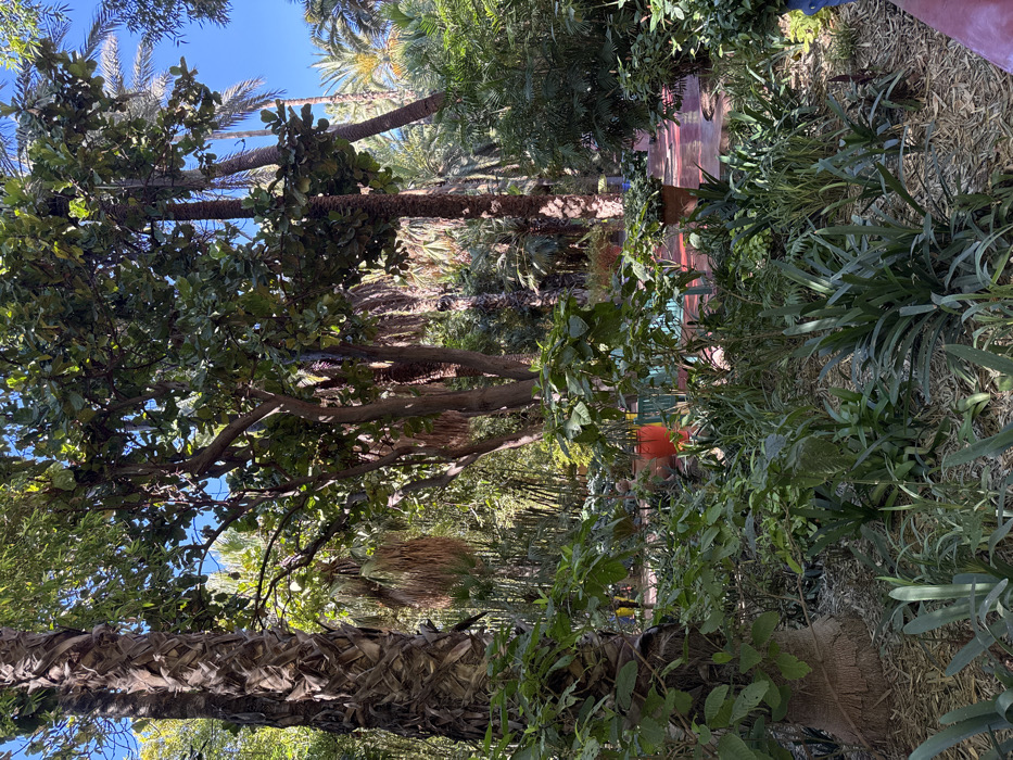 This image depicts a lush, vibrant botanical garden scene, specifically identified as the Majorelle Garden in Marrakesh, Morocco. The foreground features dense green foliage and grasses growing on a ground covered with dried leaves or mulch. To the left, a large tree trunk with a rough, textured surface rises. The midground reveals a meticulously maintained landscape with various tropical plants and trees, including slender-trunked palms and broad-leafed species. Visible objects include a prominent red/orange terracotta planter on the left, a section of bright blue architectural element (possibly a bench or wall) further back on the right, and a reddish-hued paved surface. The background is dominated by a dense canopy of palm trees and bamboo-like stalks, with patches of clear, bright blue sky visible through the foliage. Strong natural sunlight illuminates the scene, creating distinct shadows. No people, discernible actions, or interactions are visible.