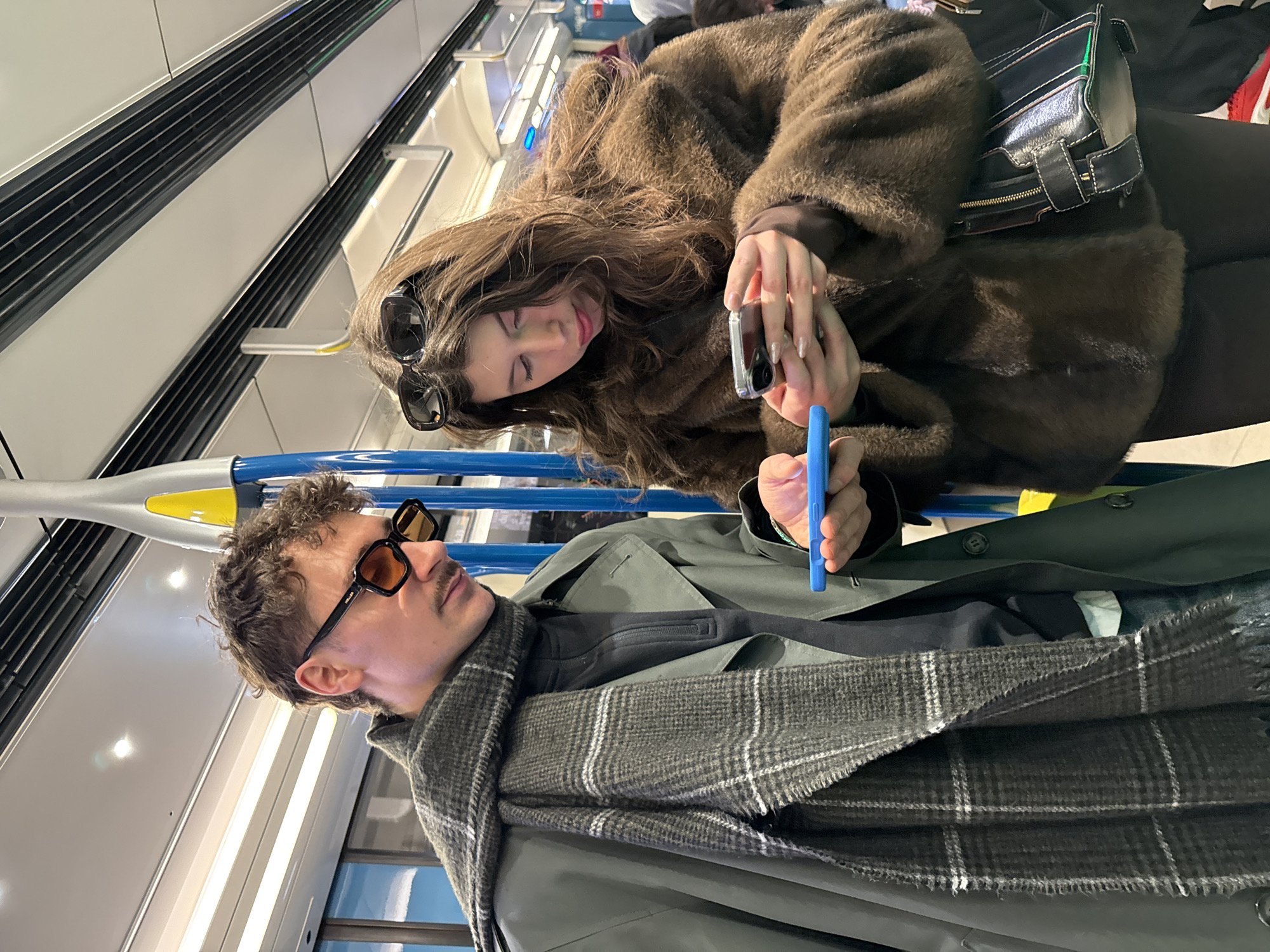 Two people are seated next to each other in what appears to be a metro car in Montreal, Canada. The woman is wearing a brown fur coat and has sunglasses perched on her head. She is holding a phone. The man is wearing a green trench coat and a grey plaid scarf. He is also wearing sunglasses. They are both looking at the woman's phone. The background shows the interior of the metro car, including seats, handrails, and windows.