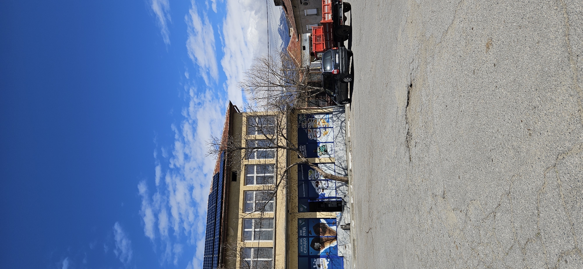 street scene in Slatino, Bulgaria. A two-story yellow building occupies the left side of the frame, adorned with blue advertisements for ice cream. Solar panels are visible on the roof. A bare tree stands in front of the building. A black car and a red truck are parked on the right side of the frame, along the edge of a gray asphalt road. A clear blue sky with scattered white clouds fills the upper left portion of the image. The image appears to be taken on a sunny day.