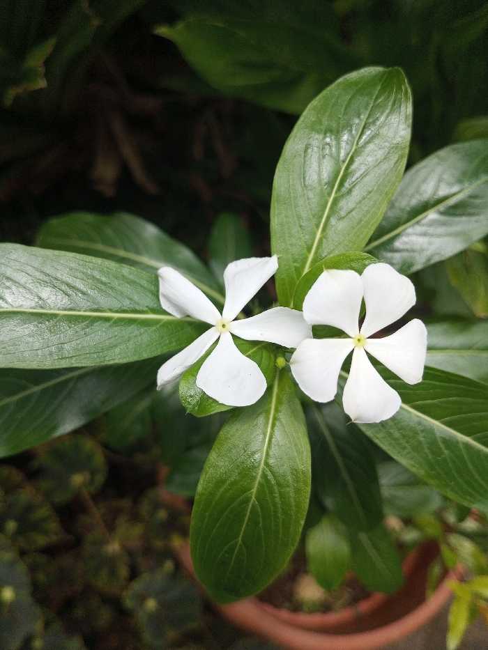 Two white periwinkle flowers bloom among vibrant green foliage. Each flower has five petals radiating from a yellow center. The leaves are ovate, glossy, and prominently veined. The plant sits in a terracotta pot, with surrounding foliage and background suggesting a lush, shaded garden setting.