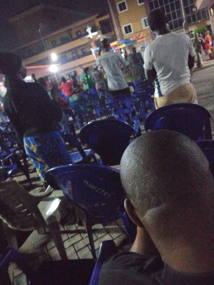 An outdoor gathering at night features a crowd of people, some standing and others sitting on blue plastic chairs. The event appears to be associated with a religious organization, possibly a church, as evidenced by the word "MINISTRY" visible on a chair. A cross is visible in the background. The photo is taken from behind a person with a shaved head, partially obstructing the view. Buildings with windows and festive decorations are visible in the backdrop.