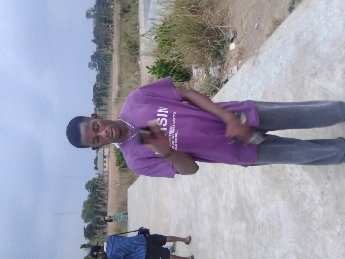 A young man stands on a concrete surface. He wears a purple t-shirt with writing, gray pants, and a necklace. He holds a phone in one hand and something else in the other. Behind him are grassy areas, a dirt path, and some trees. A couple of people are visible in the lower-left corner, one with a camera. The photo has a slightly rotated orientation.