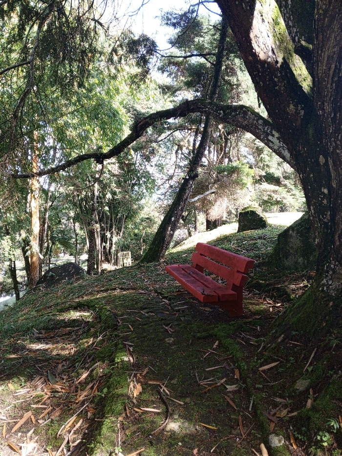 A red wooden bench sits on a mossy, sloping ground shaded by trees