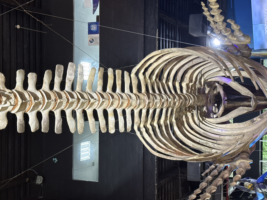 - "The image displays a large, articulated whale skeleton, specifically its dorsal spine, rib cage, and partial pectoral flipper bones, suspended vertically within a dark exhibition hall" by FM-NoYZ42, licensed under CC BY 4.0