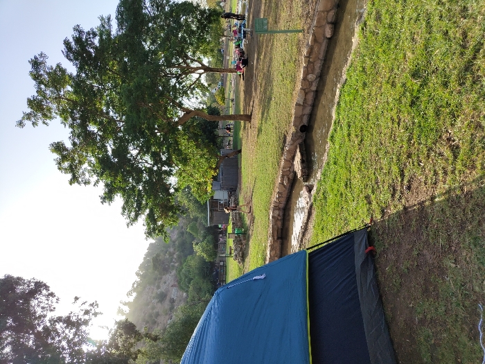 The image depicts an outdoor recreational area within the Gilboa Regional Council, Israel. In the immediate foreground to the left, a dark blue and black camping tent is pitched on green grass, with a white cord visible on the ground. A narrow, man-made stream or canal, featuring stone-lined banks, flows across the midground. The stream contains visible water and a dark pipe section, with a small stone crossing or stepping stone. Beyond the stream, a wide expanse of green grass is dotted with several mature trees displaying full green canopies. Towards the right midground, multiple individuals are seated on the grass, some appearing to use blankets or mats. Further back, near a cluster of small, utilitarian-style buildings, a single person is observed walking. A green informational sign is positioned upright in the grassy area. The background is dominated by a sunlit, rocky hillside densely covered with vegetation, rising against a bright sky, with noticeable sun glare in the upper left quadrant.