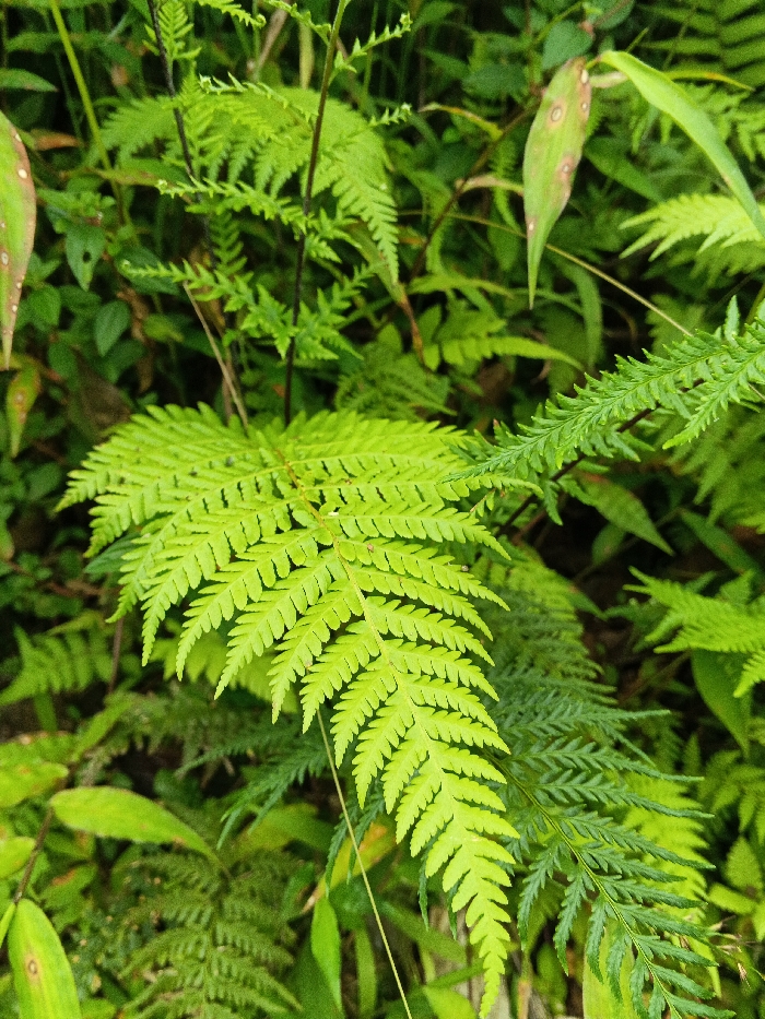 The image presents a close-up, verdant natural scene, reportedly located in the city of Unknown, Vietnam. The central and most prominent subject is a large, vibrant lime-green fern frond, displaying a detailed pinnate structure, extending from the mid-left towards the lower-right of the frame. This frond is uniformly colored and appears healthy. Surrounding and beneath this main fern are various other shades of green foliage, comprising numerous smaller fern fronds and other plant leaves, creating a dense, layered botanical environment. Some leaves in the background exhibit minor brown spotting or discoloration. No individuals, artificial objects, or explicit actions are discernible within the frame, indicating an undisturbed natural setting characterized by lush plant growth.