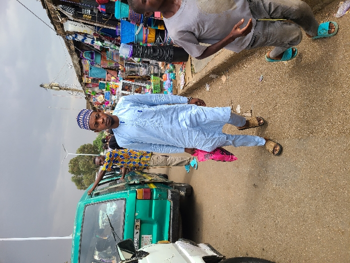 The scene depicts a bustling street market in the city of Unknown, Unknown, under an overcast sky. A man, centrally positioned, faces the camera directly. He wears a light blue traditional tunic and trousers, a dark blue and white patterned kufi cap, and brown sandals, carrying a crumpled pink plastic bag in his left hand. To his left, a light green Toyota passenger van is parked or stopped, with a man in a colorful patterned shirt and blue flip-flops standing by its open side door, appearing to interact with the vehicle. In the foreground on the right, a child in a grey t-shirt, grey trousers, and bright blue flip-flops runs past, partially cropped and in motion. The right side of the street features multiple market stalls displaying a dense array of colorful plastic household goods, metalware, and various other items. The road surface is light-colored and paved, with a raised curb separating it from the market stalls. Utility poles, streetlights, and distant trees are visible in the background.