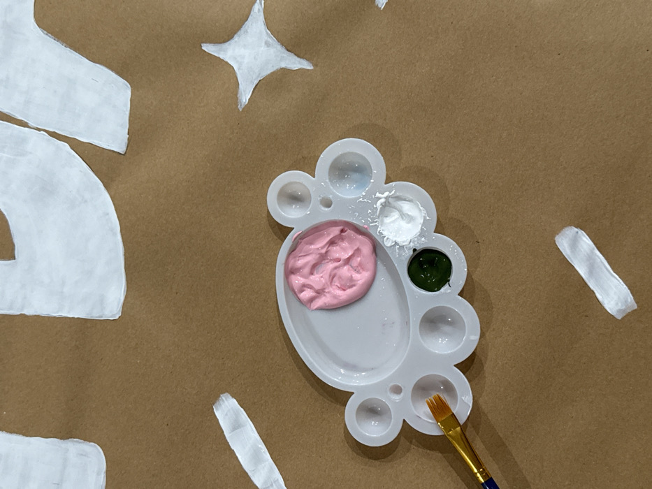 The image displays an overhead view of an art or craft project on a plain brown surface, likely paper. A gray, multi-well paint palette is centrally located in the lower half of the frame. Its largest well contains a significant amount of thick, light pink paint. A smaller well to the left of the white contains dark green paint, and another adjacent well contains white paint. A paintbrush with a blue handle and gold ferrule, featuring orange bristles, rests across an empty well on the left side of the palette. On the brown background, several white painted elements are visible: partial large block letters in the upper-left and upper-right corners, a four-pointed star in the mid-right, and two distinct elongated white brushstrokes, one in the mid-left and one in the lower-right. No individuals are present in the image. There are no discernible visual cues within the scene to indicate its specific geographic location within Los Angeles, United States.