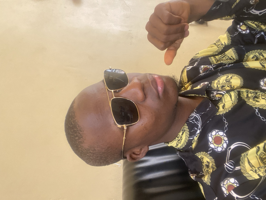 An indoor, waist-up portrait taken in the City of Unknown, Nigeria, depicts a dark-complexioned male, likely a young adult, seated in a black, high-backed office chair. The background consists of a plain, light beige wall. The male is wearing a black long-sleeved collared shirt with a repeating pattern of gold chains and medallions. He has short hair and is wearing gold-framed aviator-style sunglasses with dark lenses. His left hand is raised to chest height, with the thumb extended upwards and fingers loosely curled. He is looking slightly to the viewer's left.