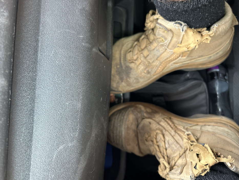 Two worn, tan work shoes rest in a confined space, likely a vehicle's compartment