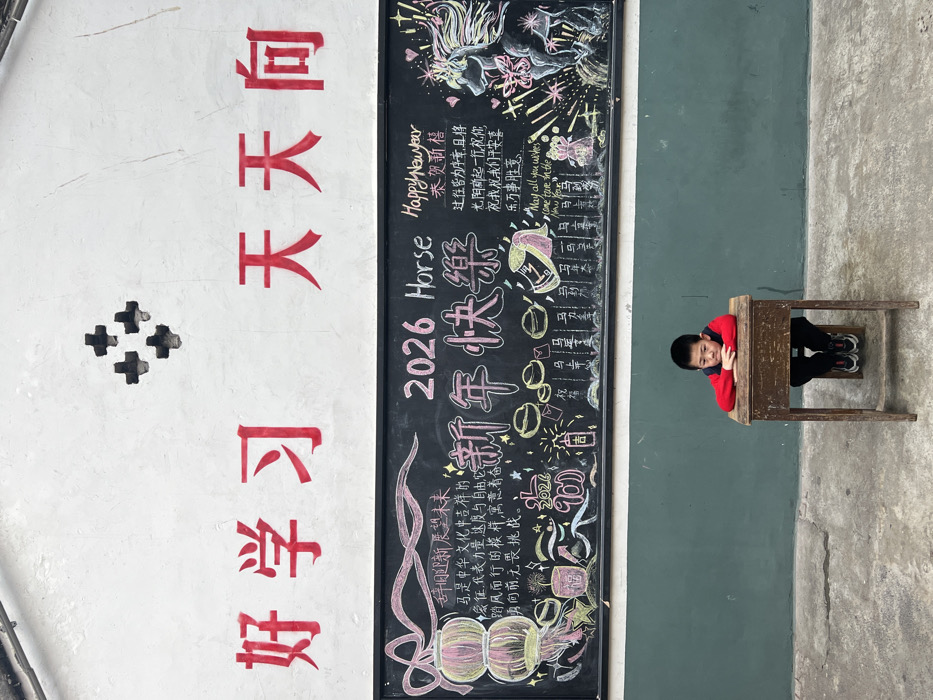 In Yuzhong District, China, a young East Asian boy is seated at an aged wooden school desk, positioned centrally in front of a painted wall. The boy wears a red long-sleeved shirt, dark pants, and black and white sneakers. He rests his forearms on the desk, hands clasped, and maintains a direct, neutral gaze forward. The background wall is horizontally divided. The upper section is white and textured, adorned with large red Chinese characters, "好学习 天天向上," which translate to "Study hard, make progress every day." Above these characters, a decorative element of four black cruciform cutouts is visible. The lower section of the wall is painted a muted green. A large black chalkboard is mounted horizontally across the white and green wall sections. It is extensively decorated with colorful chalk art. On the left, two stacked lanterns are depicted. The center features large Chinese characters for "Happy New Year" (新年快乐) and the text "2026 Horse," accompanied by various traditional auspicious symbols such as gold ingots, coins, a calendar, and the character "福" (Fu/Good Fortune). The right side of the chalkboard displays a stylized unicorn or horse figure with a flowing mane, surrounded by starbursts, alongside English text reading "Happy New Year" and "May all your wishes come true in the new year!" Additional Chinese text on the board relates to the Year of the Horse and New Year wishes. The ground in the foreground is a rough, light-grey concrete surface. The scene is illuminated by even, ambient light, suggesting an outdoor or semi-enclosed setting.