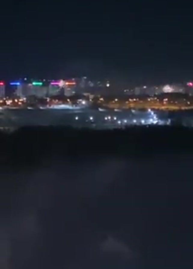 nighttime view of a city skyline with colorful lights, and fireworks going off in the distance. The foreground is dark and obscured by fog or haze. A flat roof is visible in the bottom of the frame.