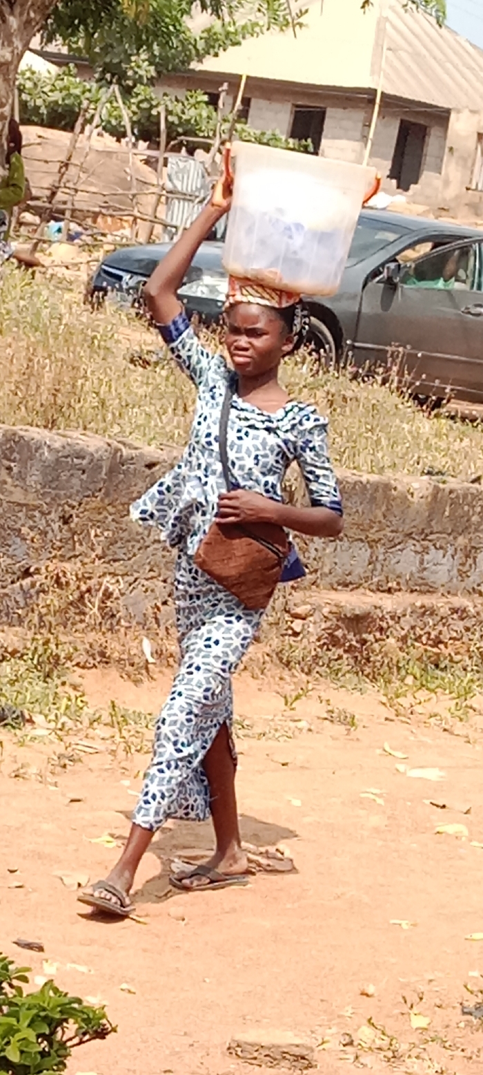 - "A young female is depicted walking rightward on a reddish-brown dirt path in Egbedi, Nigeria, under bright daylight" by FM-K2lr33, licensed under CC BY 4.0
