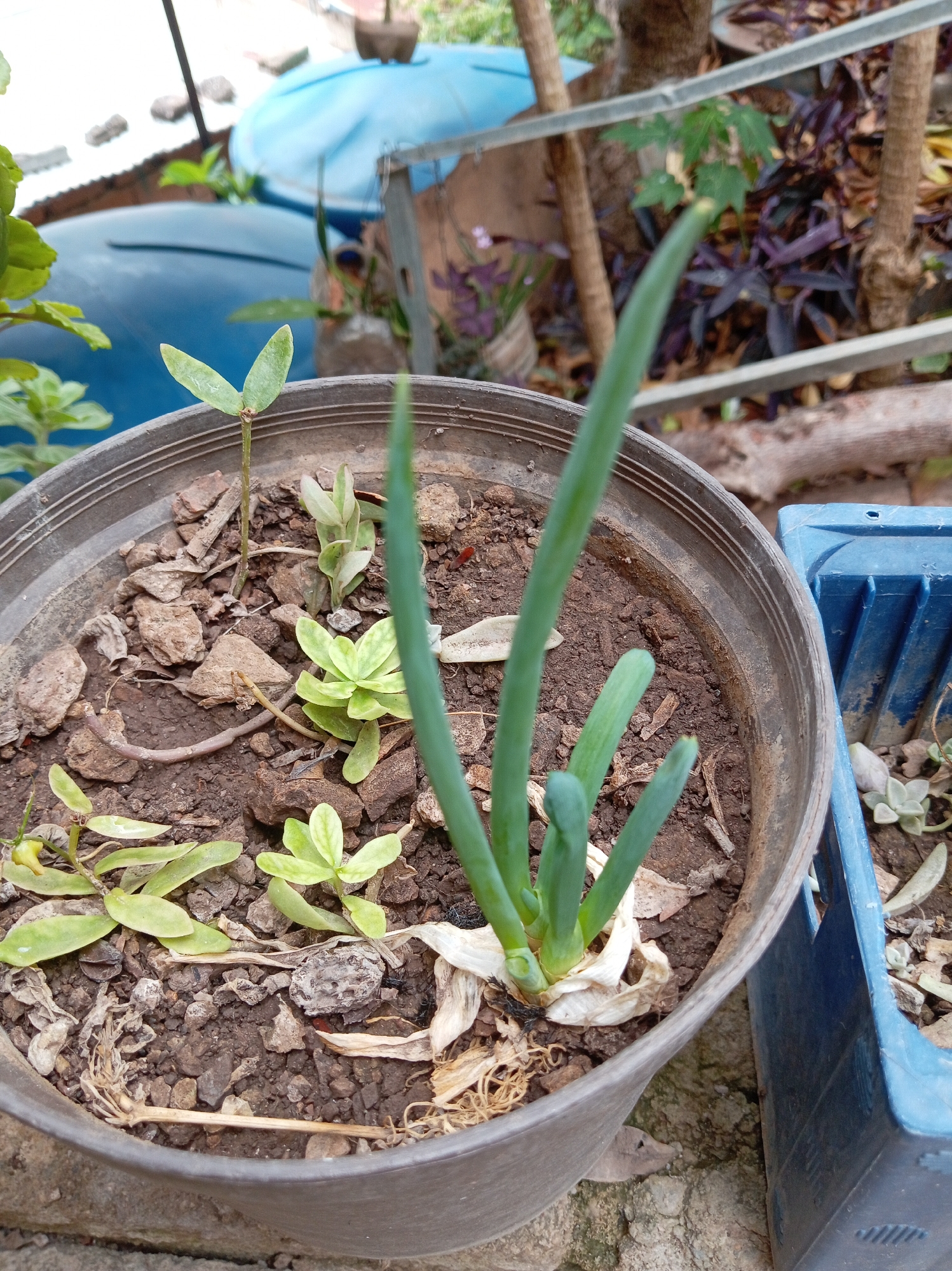potted plant, likely located in Las Tejerías, Venezuela, given the origin context. The pot is dark grey and contains an onion plant with several green stalks emerging from a white bulb base. Various other small plants and seedlings are scattered around the base of the onion plant in the pot. The soil is dark brown, mixed with small rocks and dried leaves. A blue plastic container is visible to the right of the pot. In the background, there are blurred shapes of a blue water tank, other potted plants, and various plants and trees.