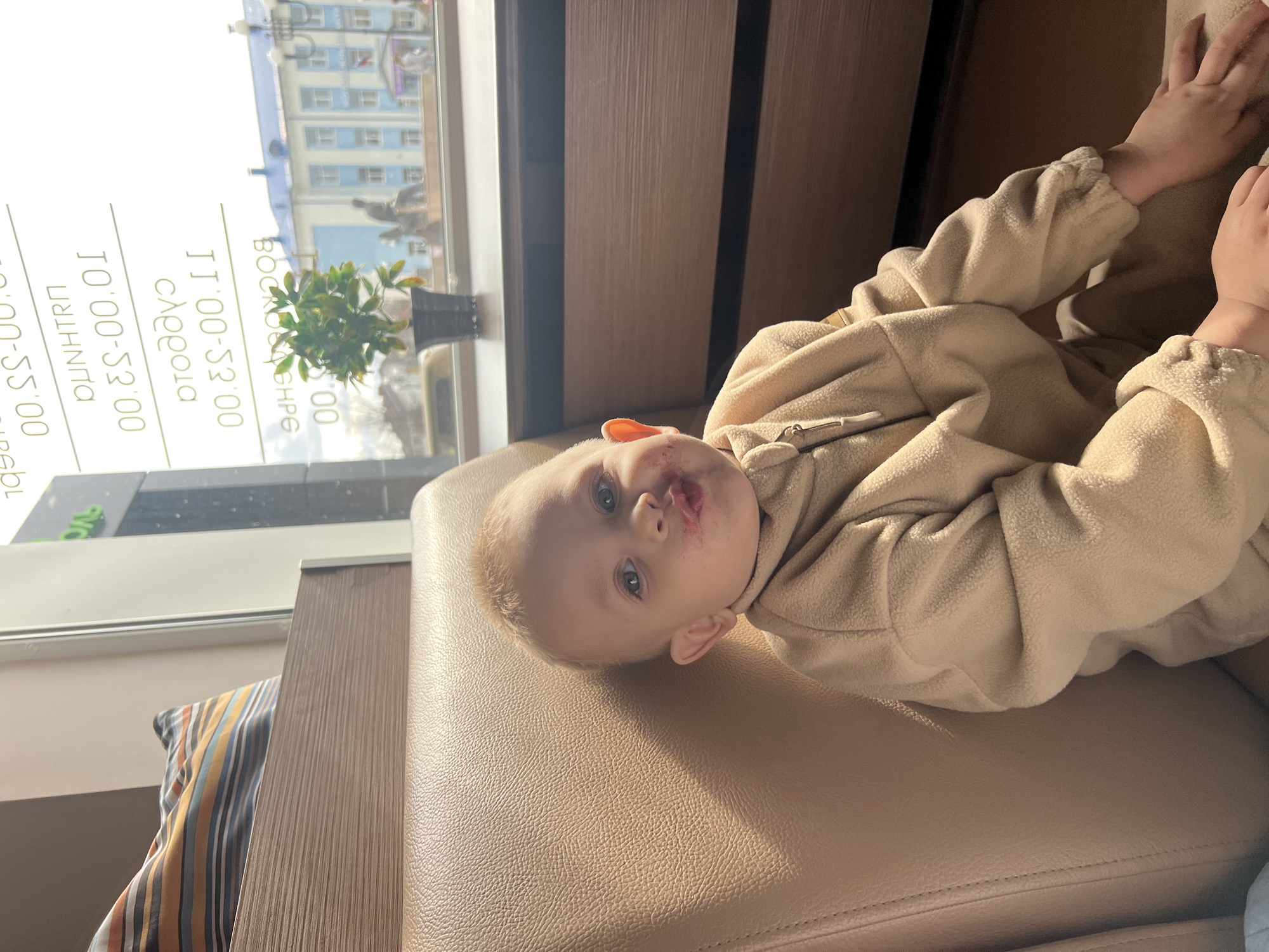 A fair-skinned toddler with reddish hair is lying on a light tan-colored leather-like surface, likely a sofa or booth seating. The child is wearing a beige fleece zip-up sweatshirt. The background shows a window with printed opening hours in Russian and a view of what appears to be a cityscape with a light blue building. Based on the opening hours listed in Russian, the location is likely a public establishment. Due to the location tag, the city is Chaikovsky, Russia.