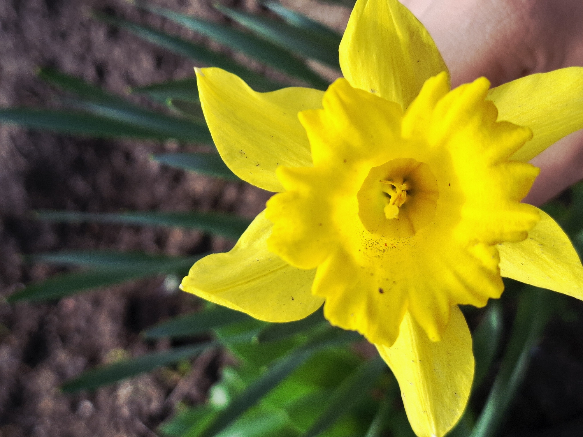 A close-up shot features a vibrant yellow daffodil. The flower has six petals arranged symmetrically around a central, frilly trumpet. Dark green, pointed leaves surround the daffodil's base. The background consists of dark brown soil and hints of a hand. The location is Unknown, Unknown.