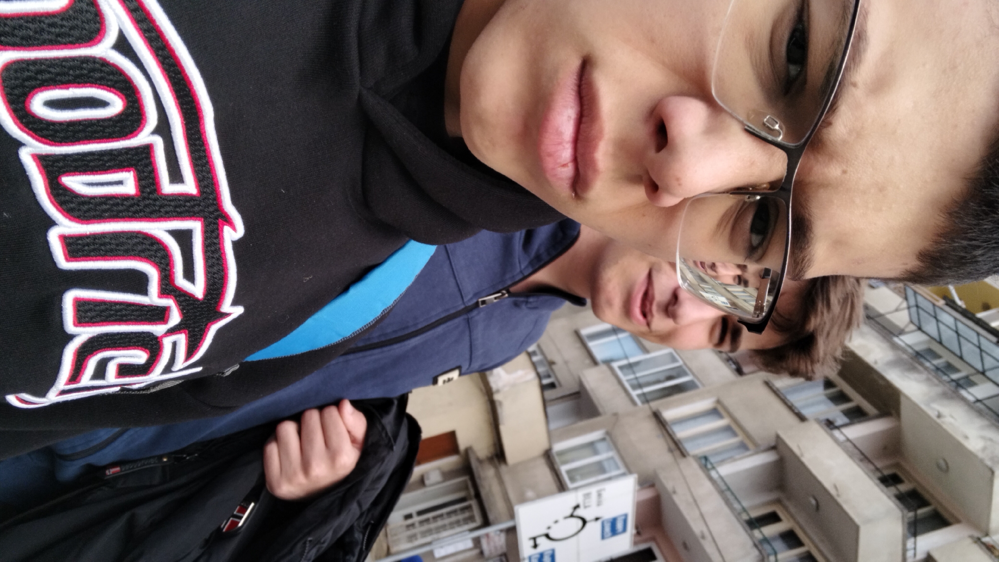 Two young males are captured in an outdoor setting in Troyan, Bulgaria. The subject in the immediate foreground, positioned left, is a male with dark hair, wearing black-framed glasses and a black hoodie with "Notric" embroidered in white and red on the chest. A blue strap, likely from a backpack, crosses his right shoulder. His expression is neutral, with a slight furrow in his brow. Behind and to the right of the foreground subject is a second male with dark hair, wearing a blue zip-up jacket and displaying a faint smile. His reflection is distinctly visible in the right lens of the foreground subject's glasses. The second male holds a black jacket draped over his right arm. The background features a multi-story, light-colored building with numerous windows and balconies. To the right, a white street sign with a black border displays black graphic symbols, including a pedestrian icon, a roundabout indicator, and directional arrows, alongside Cyrillic text such as "Лъка", "МЦ", and "ВЕЛА". The scene is illuminated by diffused daylight, indicative of overcast conditions.