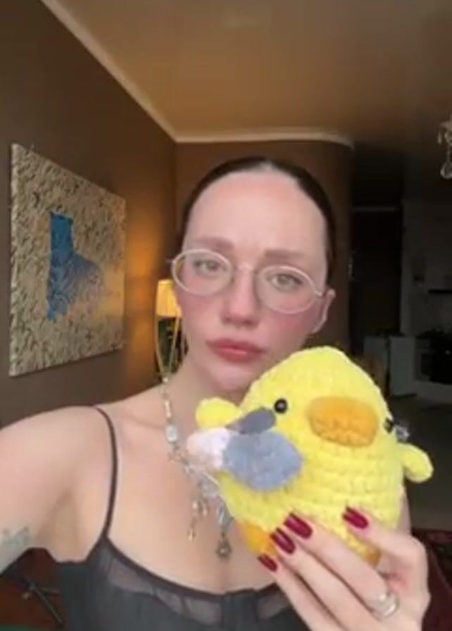 A woman with pale skin, wearing glasses, a black corset top, and jewelry, holds a yellow crocheted duck toy. Her nails are painted red. She is indoors, in a room with brown walls and artwork, including a painting of a blue cat. A lamp and a portion of a kitchen are visible in the background.